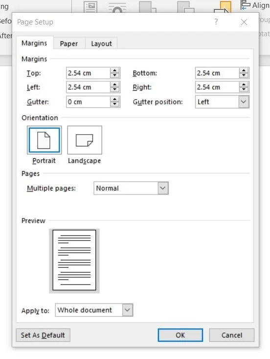 Next up, quickly double check that your margins are set to 1-inch (2.54cm) around each side. This is often the default setting under: Layout > Margins > Normal. However, if for whatever reason yours are not set up like this you can adjust it by clicking Custom Margins… at the bottom of the menu and typing in the desired amount in the Top, Bottom, Left and Right fields.